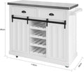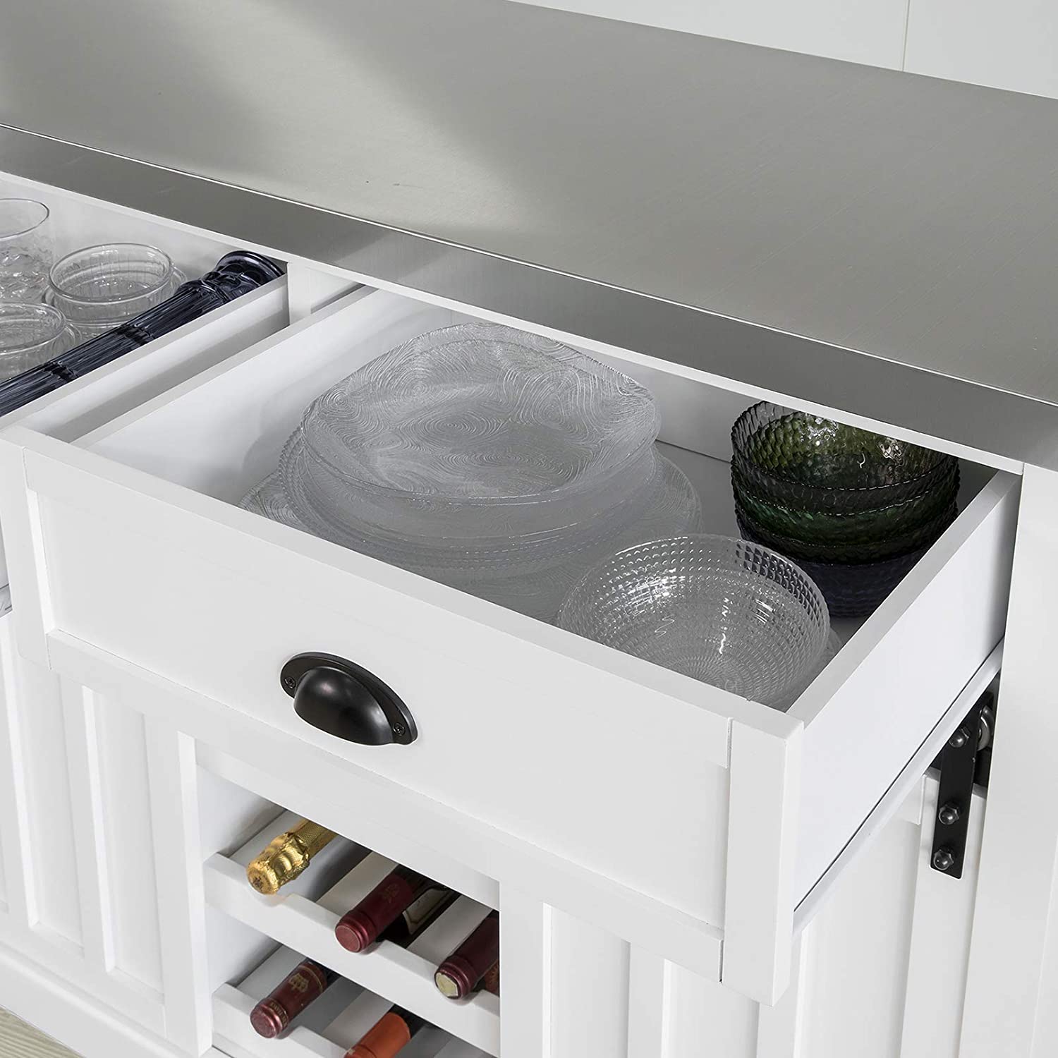 - Het heeft een roestvrijstalen werkblad, 2 lades, 2 kasten, 4 wijnrekken, 1 handdoekenrek en 4 wielen.