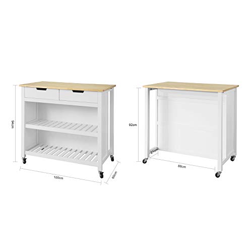 Details: De solide en mooi vormgegeven keukentrolley is ideaal voor in je keuken of ergens waar je extra opbergruimte nodig hebt voor keukengerei. Hij heeft 2 lades en 2 planken, waardoor je voldoende opbergruimte hebt. Met 4 zwenkwielen (waarvan 2 met remfunctie) kunt u de trolley gemakkelijk door uw keuken verplaatsen. Hij kan perfect gebruikt worden als eettafel of bartafel als je achterop de trolley zit. Ziet er mooi uit en is multifunctioneel. Gemaakt van hoogwaardig MDF in witte lak. Het blad is gemaakt van MDF met rubberhoutfineer. Met deze keukentrolley wordt uw keuken stijlvoller en ruimer. Productdetails Materiaal: MDF. Kleur: Wit + naturel. Afmetingen: B100 x D60 x H94cm. Gewicht: 30 kg. Draagvermogen: 60kg. Het artikel wordt geleverd in een platte verpakking en vereist zelfmontage. Gedetailleerde instructies meegeleverd. De decoratieve elementen zijn niet bij de levering inbegrepen. Als u vragen heeft, neem dan per e-mail contact met ons op, wij zullen zo snel mogelijk antwoorden!