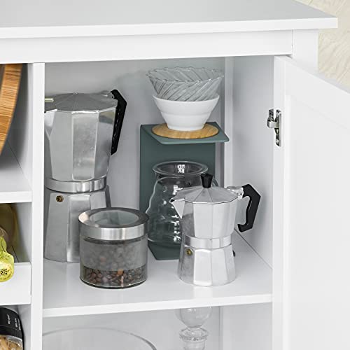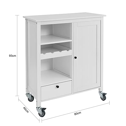 - Modern design keukentrolley voorzien van een kast met interne verstelbare plank, twee open vakken, een wijnrek en een lade.
