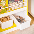 Organiseer de ruimte van uw kinderen met dit charmante witgeel-witte opbergrek. Met drie opbergvakken en plastic manden houdt hij boeken en speelgoed netjes opgeborgen.