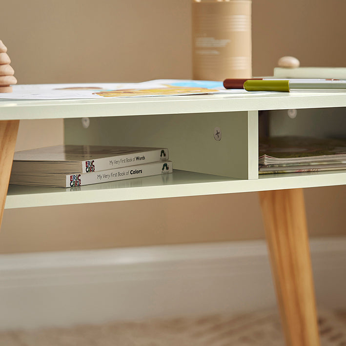 Deze Kids Activity Table Set met 2 krukken is ontworpen om de creativiteit en het leren bij kinderen te bevorderen. Nadat ze verschillende activiteiten hebben ondernomen, kunnen kinderen hun ruimte gemakkelijk indelen door boeken en knutselspullen op te bergen in de handige vakken onder de tafel.