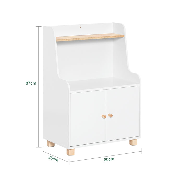 Deze boekenplank beschikt over twee open compartimenten en extra verborgen opbergruimte achter twee deuren, zodat uw kind gemakkelijk zijn favoriete spullen kan opbergen en erbij kan, waardoor de kamer opgeruimd blijft.