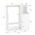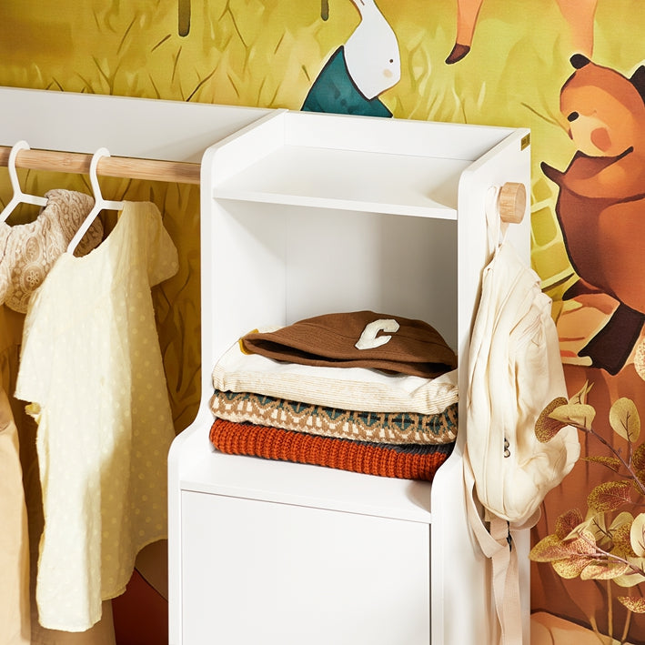 Deze kindergarderobe biedt voldoende opbergruimte voor kleding en speelgoed. Hij is gemaakt van MDF en bamboe en meet ongeveer 94x110x35cm. Het kindvriendelijke ontwerp heeft afgeronde hoeken voor de veiligheid en een kledingstang op 110 cm hoogte, zodat de kleintjes hun eigen kleding kunnen ophangen.