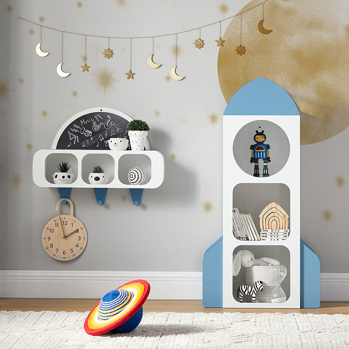 Ruime opbergmogelijkhedenMet zes compartimenten, waaronder drie in het midden, één aan de bovenkant en twee aan de zijkanten, biedt deze plank voldoende ruimte om een verscheidenheid aan spullen op te bergen. Het is ontworpen om de kamer van uw kind netjes en opgeruimd te houden.