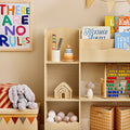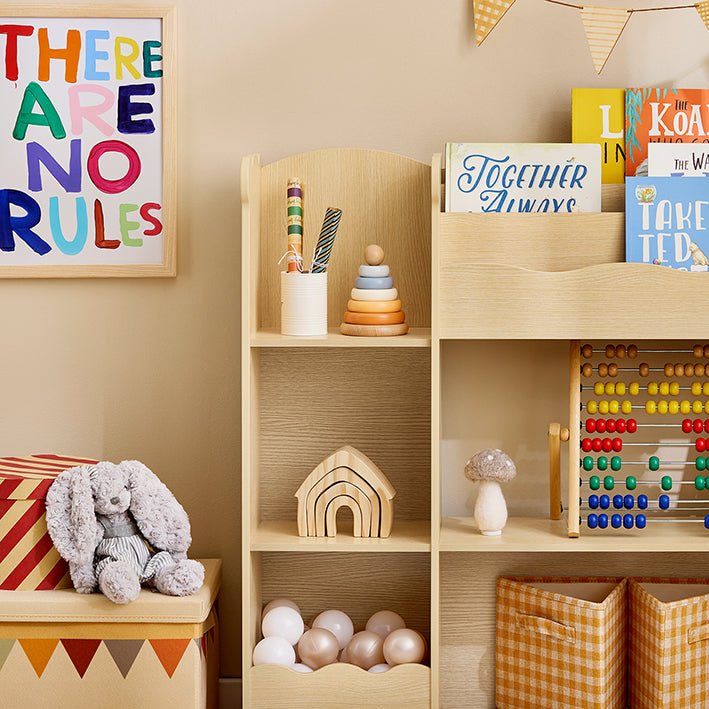 Deze kinderplank biedt meerdere opbergruimtes voor spullen van verschillende afmetingen, met specifieke compartimenten voor boeken, groot speelgoed en spullen die gemakkelijk rollen. Gemaakt van hoogwaardig MDF (E1) en voorzien van vilten voetjes om je vloeren te beschermen.