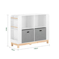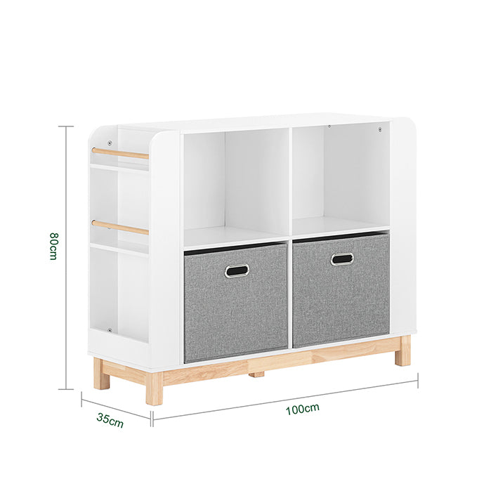 Stevige constructie:Zorgt voor de veiligheid van kinderen met rubberhouten poten en twee anti-kantelvoorzieningen.Voldoende opbergruimte:4 compartimenten, 2 stoffen dozen en 6 planken voor eenvoudige organisatie.