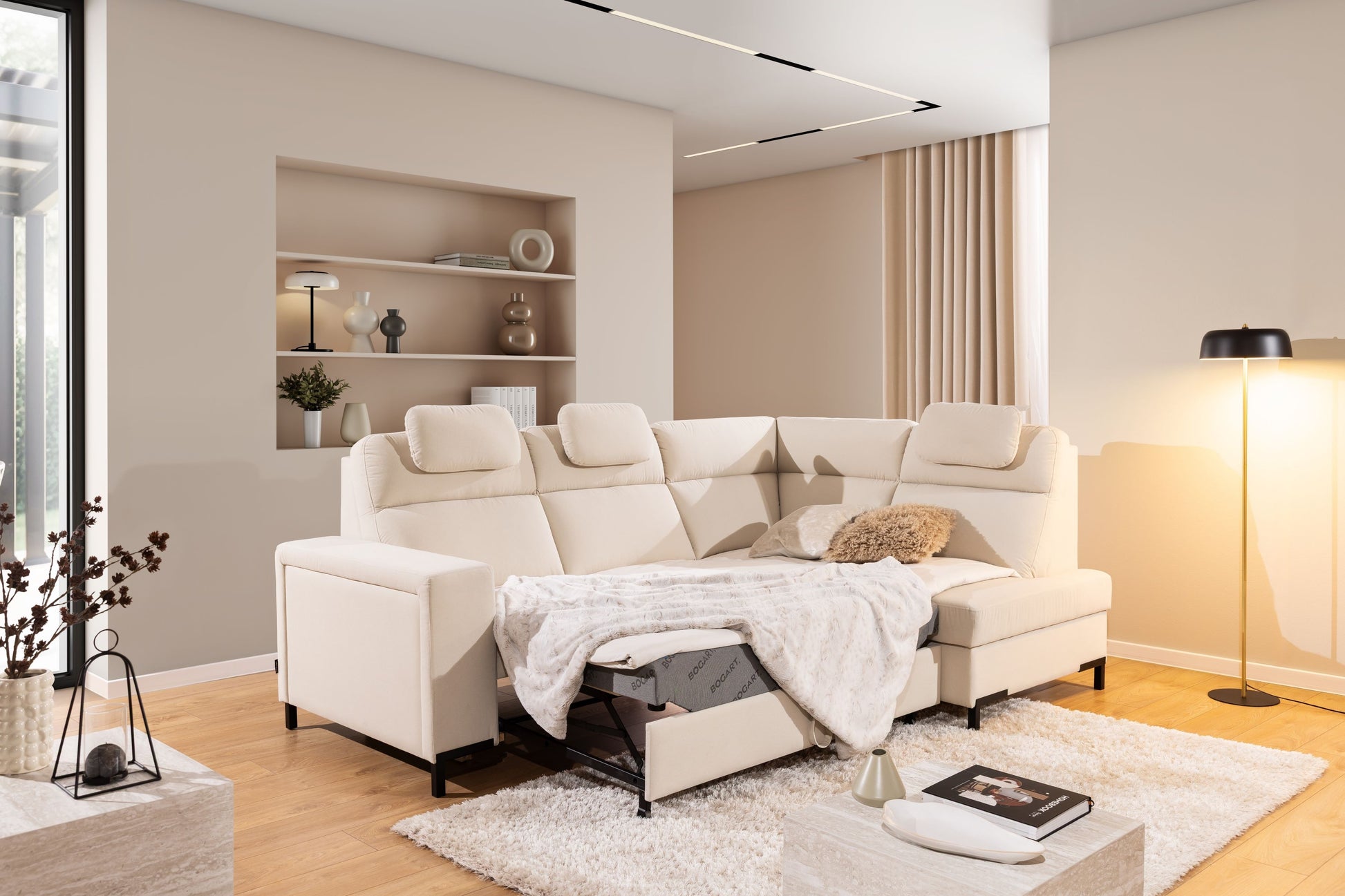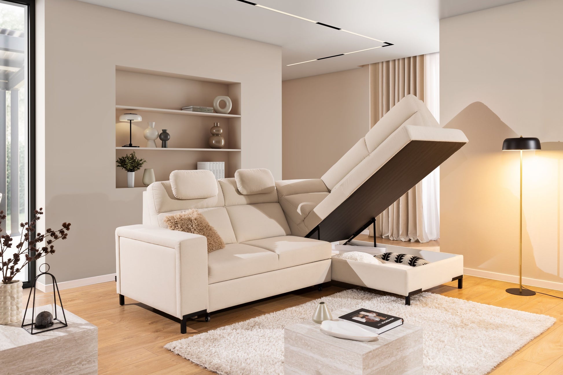 De Loario L hoekbank is ideaal voor gezinsleven, ontspannen avonden of als extra slaapplaats voor gasten dankzij de handige Dolphin-slaapfunctie. De zitting met golfveren en polyurethaanschuim biedt optimaal zitcomfort en langdurige veerkracht. Dankzij de afneembare achterkant en modulaire opbouw kunt u de bank vrij in de ruimte plaatsen. Perfect passend in moderne, Scandinavische of loft-interieurs—combineer met accessoires naar eigen smaak. Inclusief opbergruimte en eenvoudige zelfmontage.