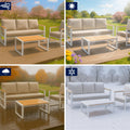 Het frame van de set bestaat uit hoogwaardig, roestvrij aluminium. De tafel en armleuningen zijn vervaardigd van duurzaam HDPE-kunststof dat bestand is tegen alle weersomstandigheden en UV-straling. Daardoor is deze loungeset perfect geschikt voor gebruik in de tuin, op het terras of op het balkon.