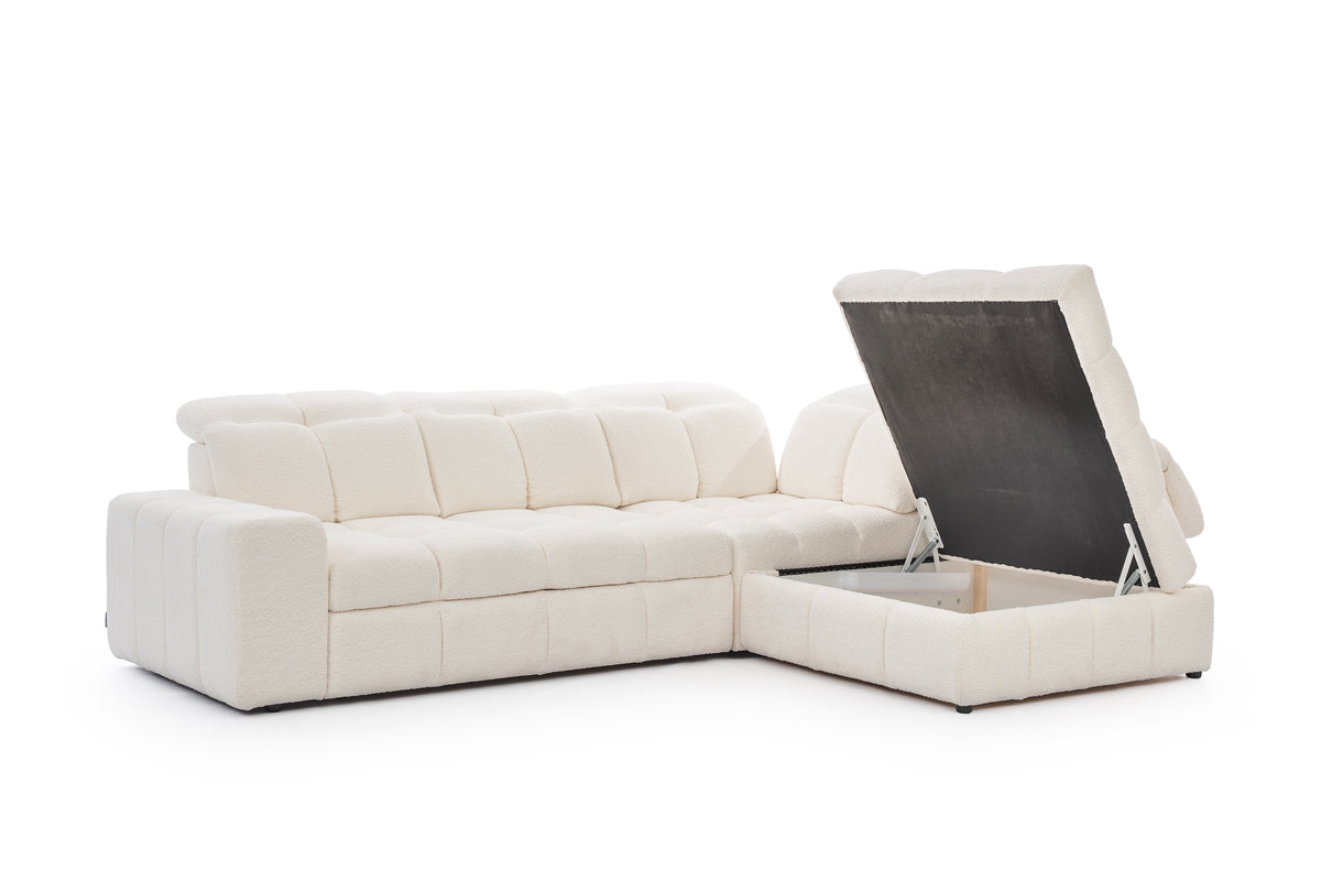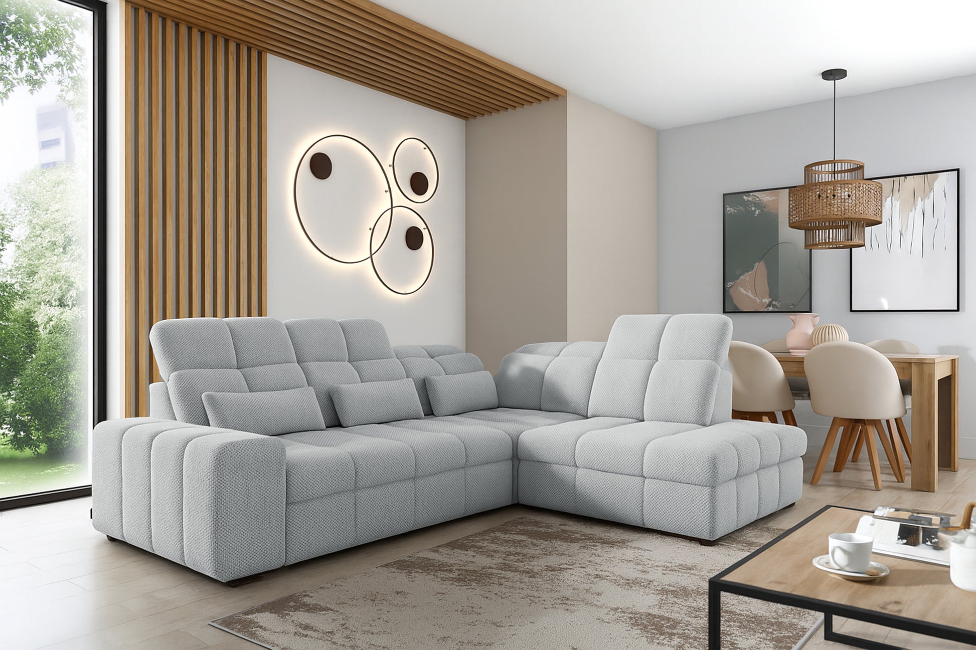Profiteer elke dag van veelzijdige functies zoals de Dolphin-slaapfunctie, waarmee je de hoekbank eenvoudig transformeert tot royaal bed. Ideaal voor gasten of dagelijks gebruik, met een ruime beddengoedbox voor extra opbergruimte. De verstelbare hoofdsteunen en een verschuifbare rugleuning maken persoonlijke aanpassing mogelijk voor elk gezinslid. Deze hoekbank is perfect voor moderne, minimalistische en Scandinavische interieurs en brengt licht, frisheid en elegantie in elke ruimte.