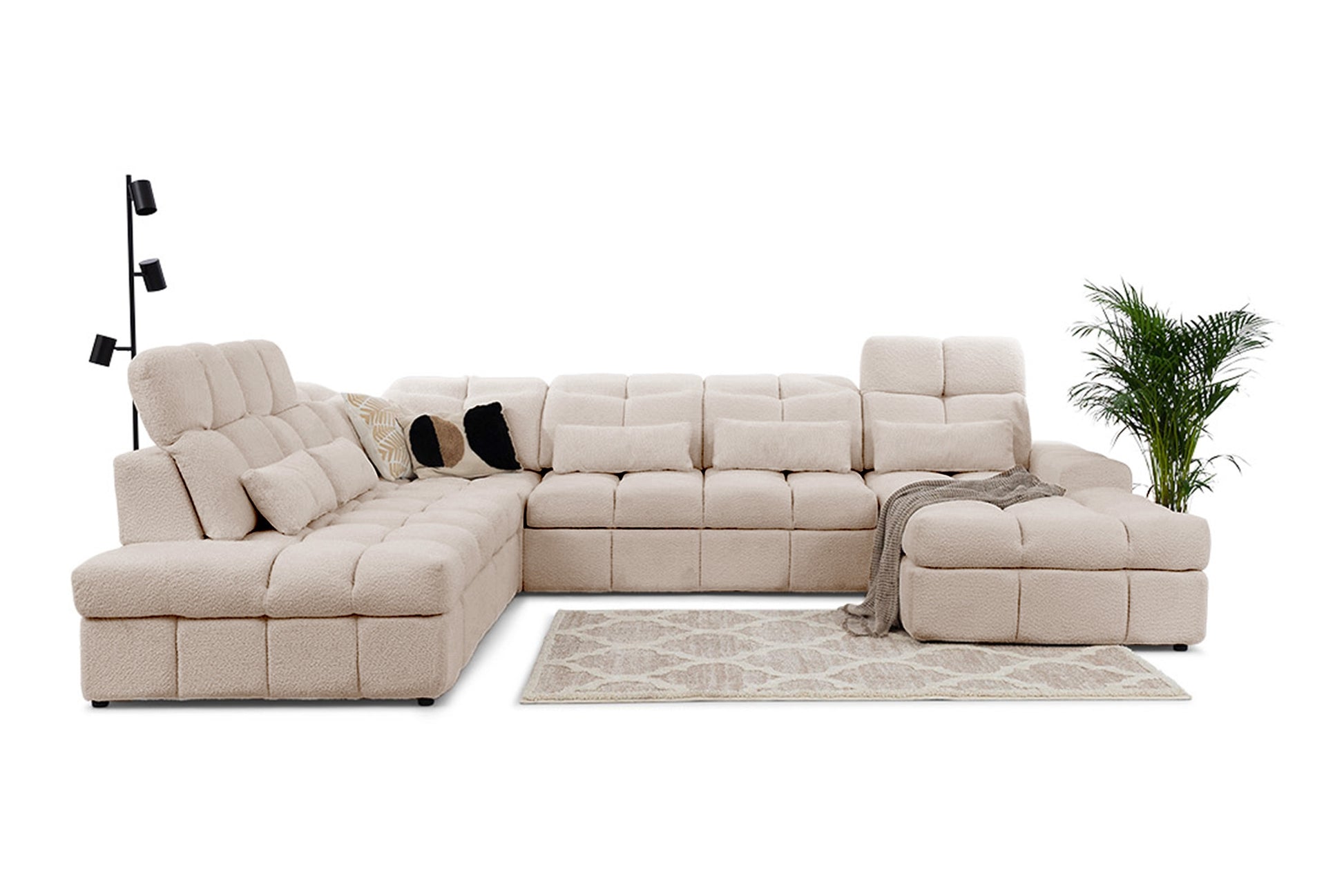 Geef uw woonkamer een stijlvolle upgrade met de Magnelio U II elektrische hoekbank in elegante beige boucle Catch Me 02. Deze luxe U-vormige bank combineert het hoogste comfort met gebruiksgemak dankzij de elektrisch uitschuifbare zitting. Het moderne ontwerp, strakke lijnen en zachte bekleding zorgen voor een sfeer van rust en harmonie. Vervaardigd uit kwalitatief hout, spaanplaat en zeer elastisch HR-schuim, biedt deze bank niet alleen een comfortabele zitervaring maar ook uitstekende duurzaamheid, perfect passend in elke interieurstijl.