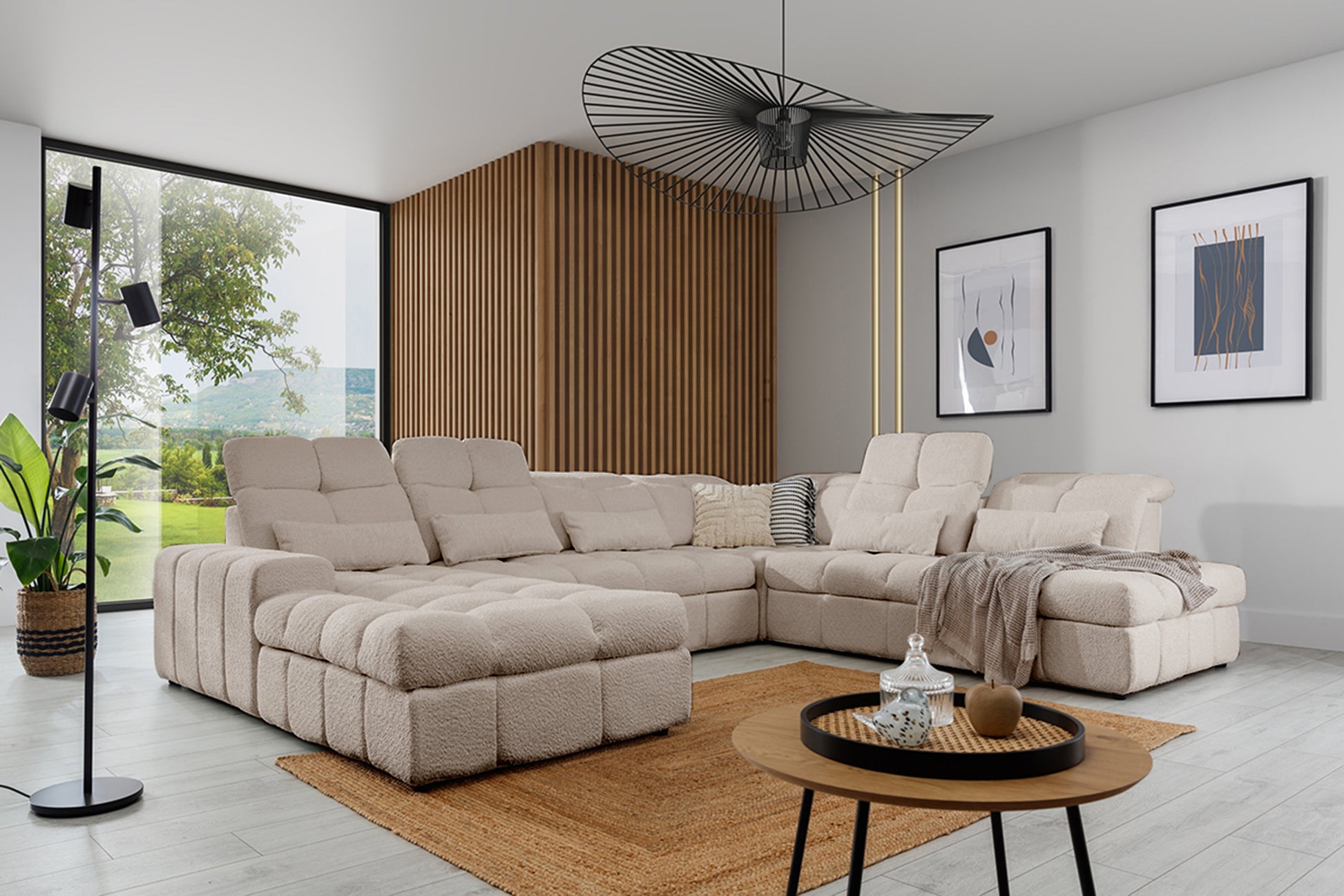 Ontdek de Magnelio U II hoekbank met slaapfunctie, rechts uitgevoerd in stijlvolle beige bouclé stof. Deze moderne U-vormige bank combineert elegantie en functionaliteit, met luxe bekleding die comfort en uitstraling biedt aan elk interieur. De stevige constructie van hout en spaanplaat verzekert langdurige duurzaamheid, terwijl de HR-schuim zitting en golfveren ultiem zitcomfort garanderen. Verstelbare hoofdsteunen, verschuifbare rugleuningen en geïntegreerde beddengoedopslag maken deze bank de ultieme keuze voor wie comfort en gebruiksgemak wenst.