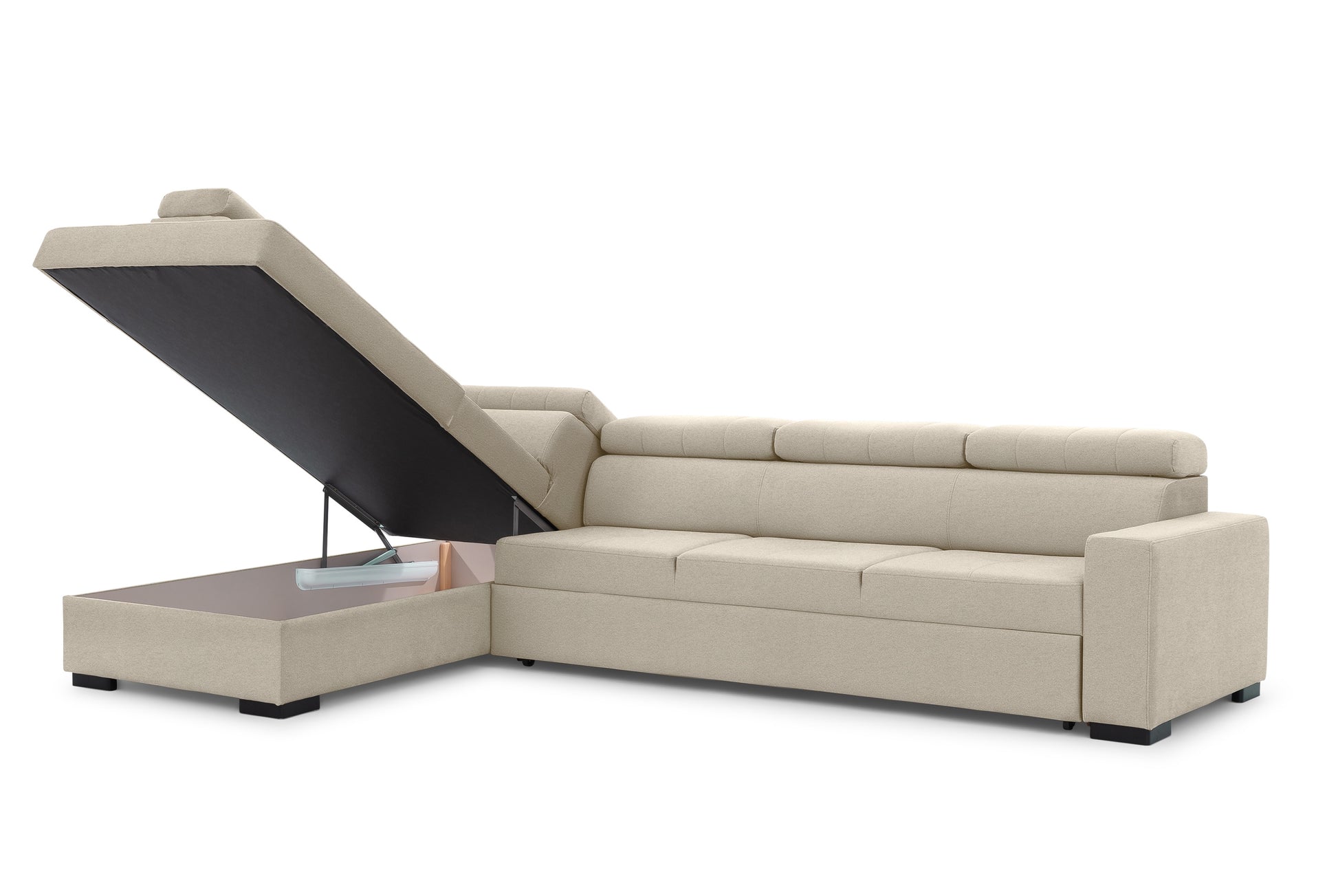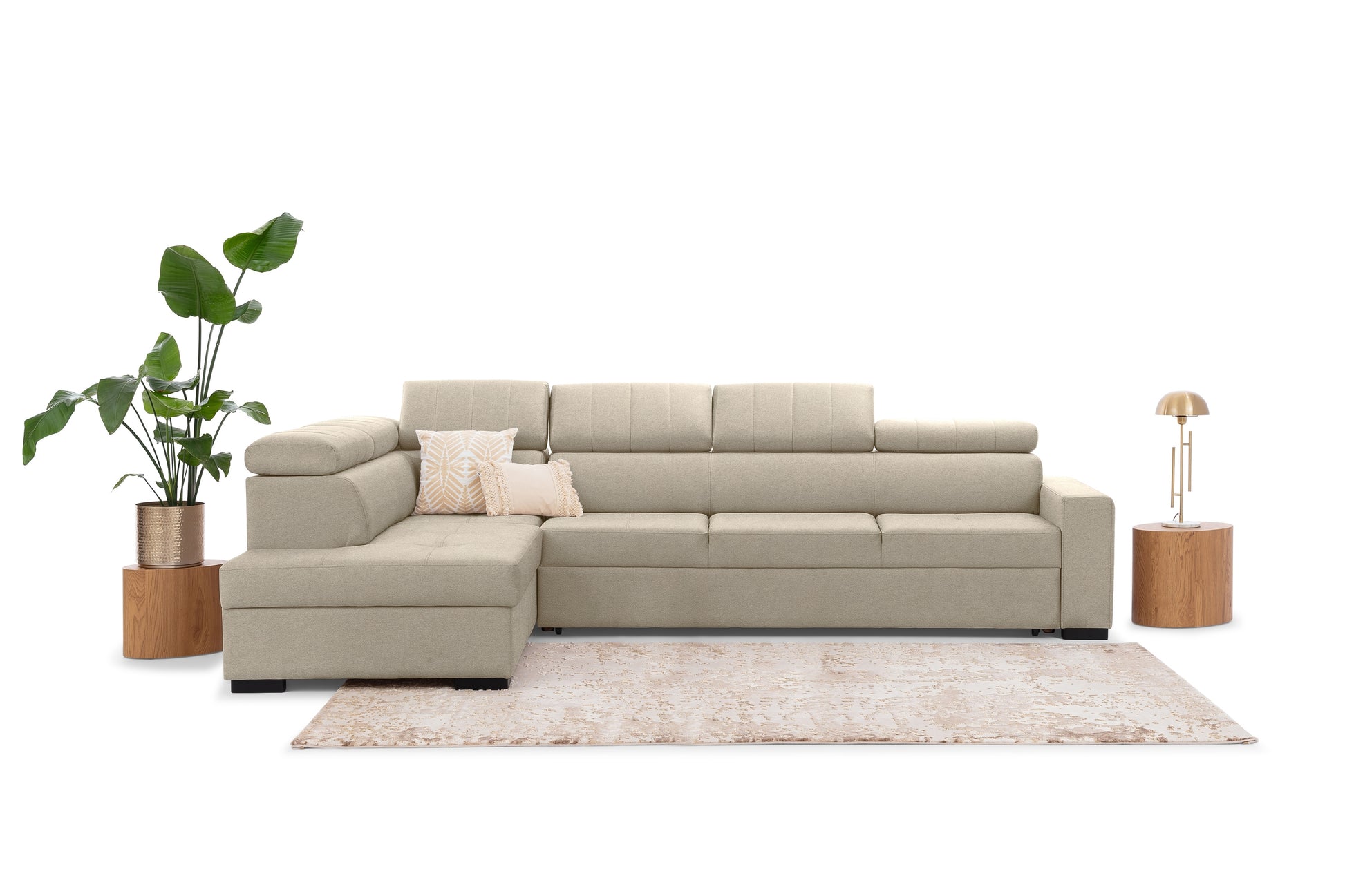 Deze royale hoekbank biedt een praktische slaapfunctie met een groot slaapoppervlak (265x126 cm) voor twee personen én een handige beddengoedcontainer. Dankzij de verstelbare hoofdsteunen vindt iedereen zijn ideale zitpositie voor ontspannen avonden. De Modeno Maxi past perfect in moderne, minimalistische en Scandinavische interieurs. Ideaal voor gezellige familieavonden, gasten of dagelijks gebruik. Met eenvoudig uitklapmechanisme wordt de bank in een handomdraai een bed. Ontdek de perfecte combinatie van stijl, functionaliteit en comfort.