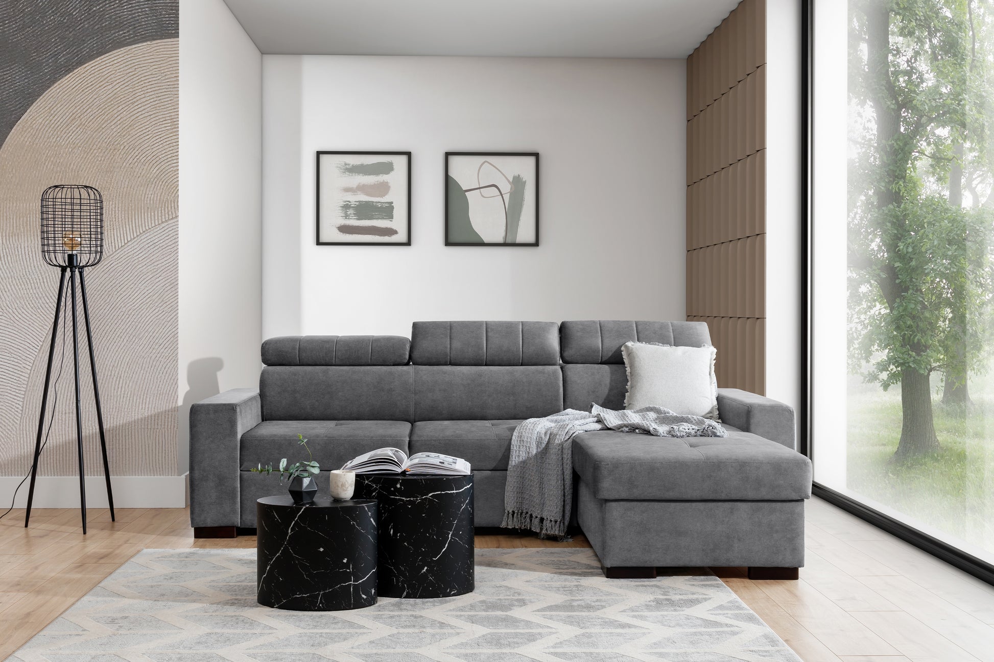 Ontdek de veelzijdige Modeno Mini hoekbank met slaapfunctie, bekleed met onderhoudsvriendelijk grijs fluweel Zetta 304. Het stijlvolle ontwerp wordt geaccentueerd door elegante, wengékleurige poten en verstelbare hoofdsteunen, wat zorgt voor optimaal zitcomfort en een moderne uitstraling. De hoogwaardige materialen, waaronder een stevige houtconstructie, T30-polyurethaanschuim en golfveren, garanderen duurzaamheid en langdurig comfort. Met zijn universele vormgeving is deze hoekbank zowel links als rechts te plaatsen en biedt hij maximale flexibiliteit voor elke woonkamer.