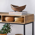 Ruime opbergmogelijkhedenMet twee open vakken biedt deze consoletafel voldoende ruimte voor het opbergen van boeken, tijdschriften en andere benodigdheden. Het grote vak eronder is perfect voor het tentoonstellen van planten of decoratieve voorwerpen, waardoor de esthetiek van uw ruimte wordt verbeterd.
