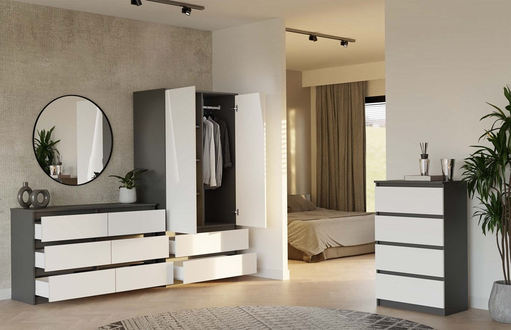 De MALWA M6 ladekast is een elegant meubelstuk dat met zijn moderne uitstraling ieder interieur verrijkt. Het antracietkleurige lichaam in combinatie met de minimalistische witte fronten zorgt voor een frisse en tijdloze look. Dankzij de zes ruime lades biedt deze kast voldoende opbergruimte voor kleding, documenten en diverse accessoires. Ergonomische, greeploze fronten benadrukken het strakke design en maken dagelijks gebruik comfortabel. De duurzame, kras- en vochtbestendige materialen garanderen jarenlang plezier en eenvoudig onderhoud, waardoor de ladekast perfect is voor gezinnen en moderne werkplekken.