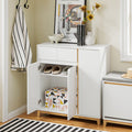 Deze moderne schoenenkast in wit en bruin heeft elegante bamboe poten, twee lades en drie deuren. De linkerdeuren bevatten een in hoogte verstelbare plank voor schoenen van verschillende maten. Dankzij de compacte afmetingen is hij ideaal voor elke gang.