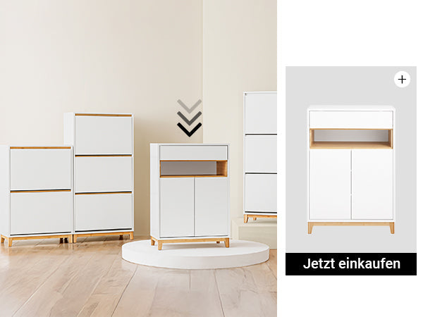 - Moderne schoenenkast met bamboepoten en lades in wit en natuur