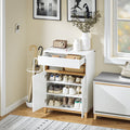 Deze moderne schoenenkast heeft bamboe poten, in hoogte verstelbare planken en een wit en bruin design.