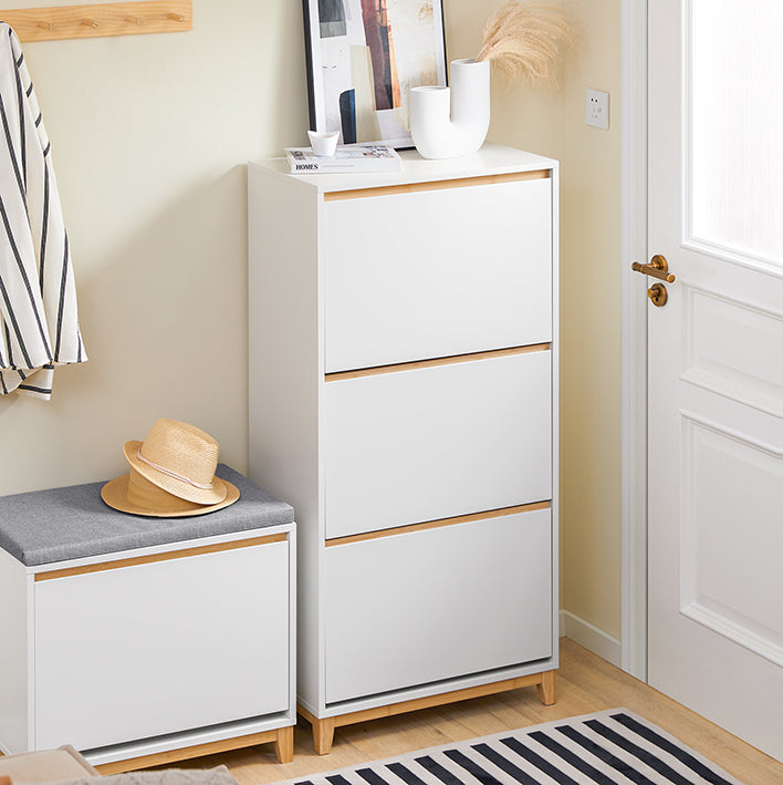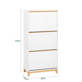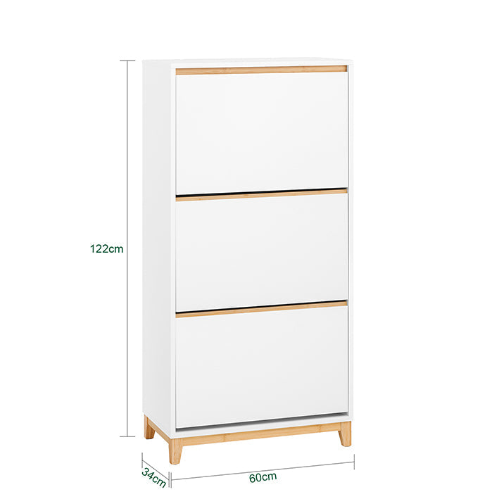 Deze moderne schoenenkast in wit en bruin heeft drie opklapbare vakken voor optimaal gebruik van de ruimte. Dankzij de opvouwbare schoenenvakken kun je gemakkelijk bij de schoenen en blijven ze stofvrij. De compacte afmetingen van 60 cm breed, 122 cm hoog en 34 cm diep zijn perfect voor smalle ruimtes.