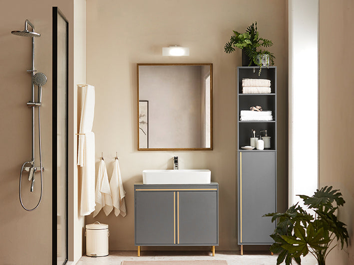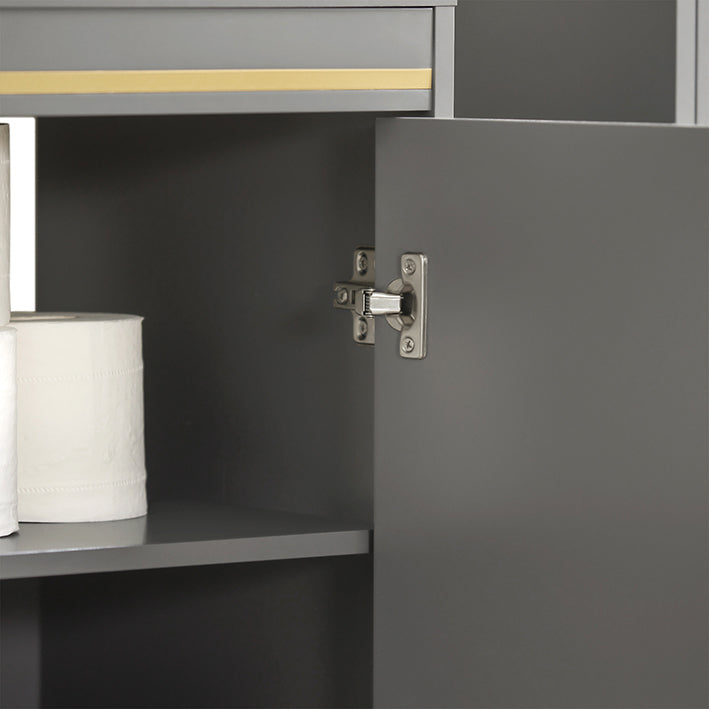 Elegant ontwerpDe chique combinatie van grijze en gouden afwerkingen voegt niet alleen een vleugje elegantie toe aan uw badkamer, maar past ook bij elke interieurstijl. Deze kast transformeert uw ruimte met zijn verfijnde uitstraling.