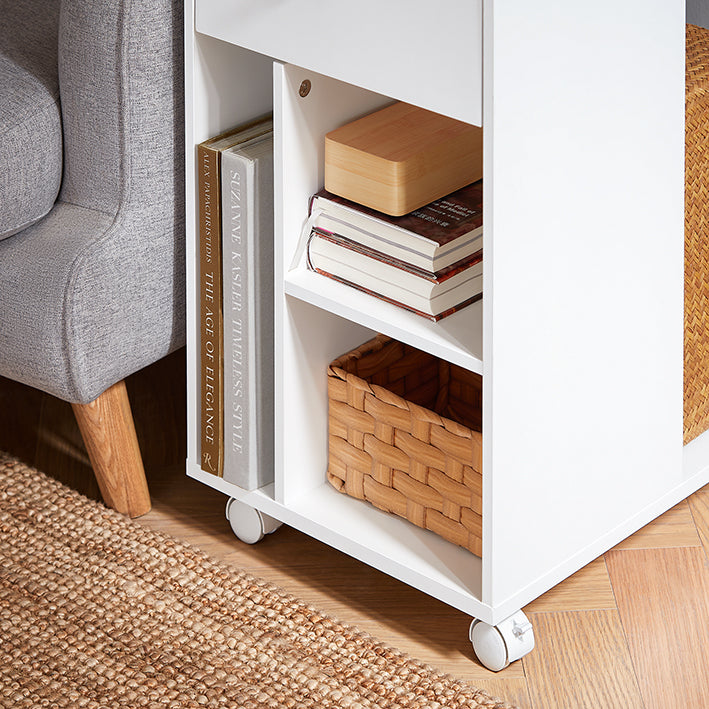 De nachtkastje-serveerwagen biedt een handige oplossing met een lade en drie open planken om essentiële spullen georganiseerd te houden. Dit veelzijdige stuk bevat een praktische rail voor een tablet en heeft een uniek C-vormig ontwerp dat ruimte bespaart.