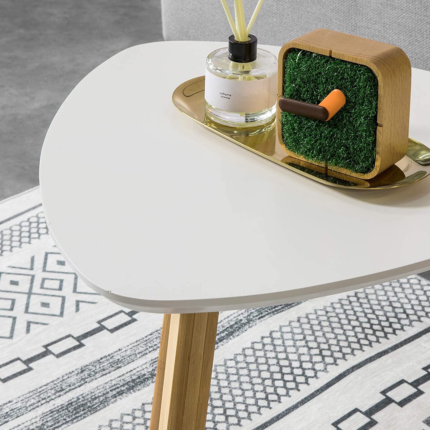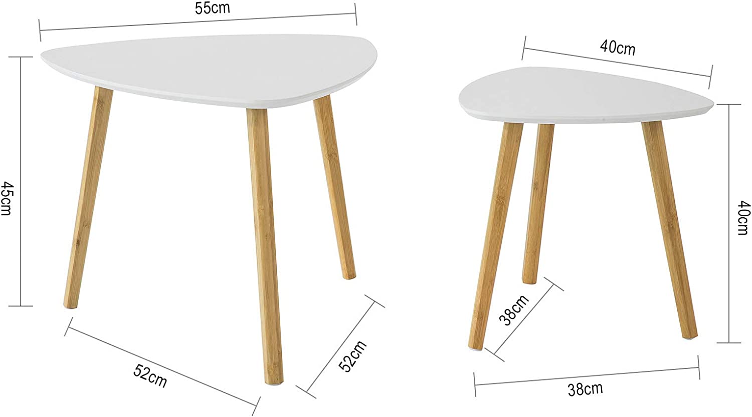 Details: Moderne bijzettafels passen perfect bij uw moderne of traditionele inrichting. 2 tafels ontworpen voor gratis combinatie en handig gebruik in woonkamer, slaapkamer en kantoor om snacks, drankjes, boeken, lampen enz. bij de hand te hebben. Het is geweldig om te gebruiken als bank/bijzettafel, zodat je bij de hand hebt wat je nodig hebt. Praktisch en ruimtebesparend, goede aanvulling op uw huis. Productdetails Materiaal: MDF, bamboe. Afmetingen: Grote tafel: L55 x B55 x H45cm; Kleine tafel: L40 x B40 x H40cm. Gewicht: 6 kg. Draagvermogen: 25kg/tafel. Het artikel wordt geleverd in een platte verpakking en vereist zelfmontage. Gedetailleerde instructies meegeleverd. De decoratieve elementen zijn niet bij de levering inbegrepen. Als u vragen heeft, neem dan per e-mail contact met ons op, wij zullen zo snel mogelijk antwoorden!