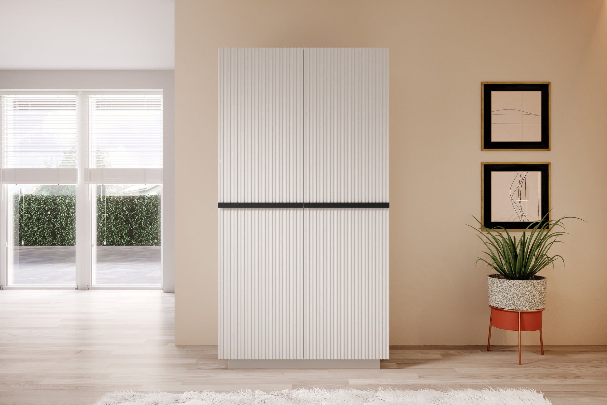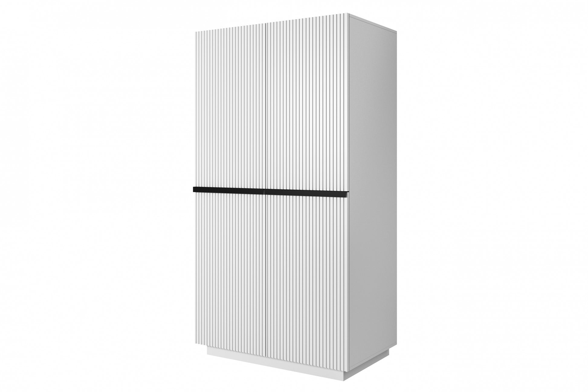 Maak uw interieur compleet met de stijlvolle Nicole kledingkast van 100 cm breed met elegante gegroefde fronten en moderne zwarte metalen handgrepen. De kast heeft een prachtige matte witte afwerking die zorgt voor een tijdloze uitstraling in elke ruimte. Dankzij het hoogwaardige gelamineerd karton en MDF biedt deze kast optimale duurzaamheid en stabiliteit. Met zes praktische planken en een kledingroede is er volop opbergruimte voor kleding, schoenen en accessoires. De stalen scharnieren met stil sluitsysteem en het comfortabele deuropeningssysteem maken de kast tot een gebruiksvriendelijke keuze voor elk huishouden.