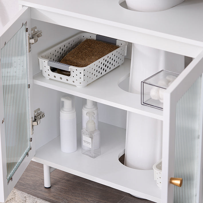 Royale opbergruimte: Biedt ruimte voor dagelijkse badkamerbenodigdheden< br> Stijlvol ontwerp: Mooie witte en fleece-afwerking verbergt lelijke afvoersystemen< br> Ergonomische hoogte: Past zich aan de lichaamsgrootte van de meeste gebruikers aan voor comfortabele toegang< br> Opties voor aankoop van een set: Combineer met andere stukken voor een complete badkamerset< br>