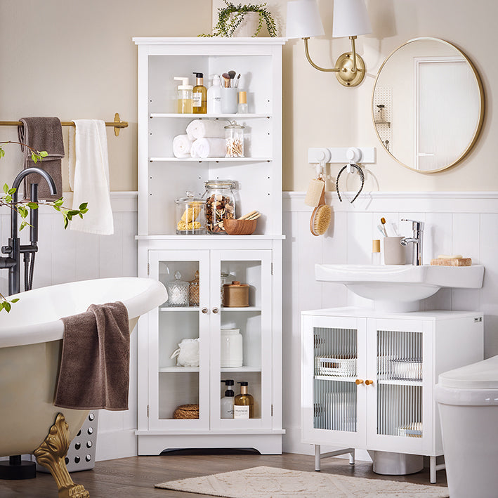 Deze onderkast met twee deuren en een scheidingswand biedt opbergruimte voor toiletartikelen en schoonmaakmiddelen en past naadloos in elk badkamerdecor.