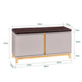Deze moderne en stijlvolle opbergbank past perfect in verschillende ruimtes, zoals de hal, woonkamer of slaapkamer. De bank heeft verstelbare planken achter twee deuren, waardoor er veelzijdige opbergmogelijkheden zijn. Met vier compartimenten organiseer je schoenen netjes. Geniet van comfortabel zitten met het gevoerde kussen.