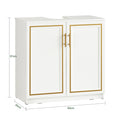 Deze onderkast heeft twee deuren en een scheidingswand, waardoor er voldoende ruimte is voor alledaagse spullen zoals toiletpapier en schoonmaakmiddelen. De witte MDF(E1) kast met gouden handgrepen zorgt voor een stijlvolle uitstraling en verbergt het afvoersysteem. Voetkussentjes beschermen de verf tegen vocht, waardoor deze duurzamer en langer meegaat.