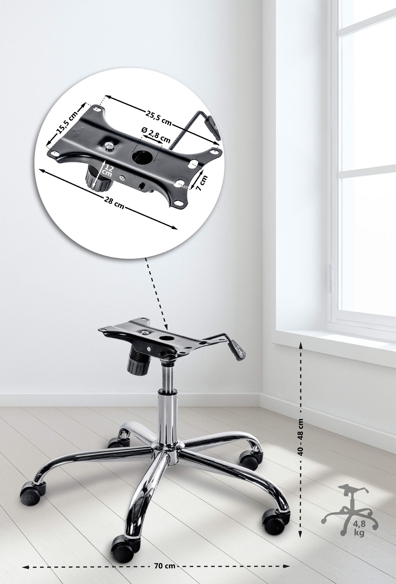 Dit frame biedt de mogelijkheid om jouw bureaustoel te repareren of weer als nieuw te laten stralen. Mocht het frame van je bureaustoel beschadigd zijn en niet meer naar wens functioneren, dan hoef je niet meteen een nieuwe stoel aan te schaffen. Dit frame kan universeel geïnstalleerd worden voor stoelen met de juiste afmetingen. Het beschikt over vijf soepel lopende wielen, is hoogte verstelbaar en heeft een schommelfunctie.