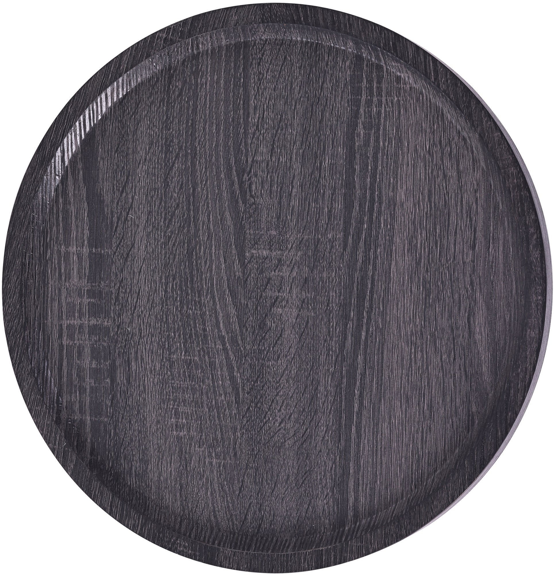 Het ronde houten tafelblad geeft de tafel een natuurlijke, warme uitstraling, terwijl het robuuste, matzwarte, gepoedercoate metalen frame zorgt voor stabiliteit en een moderne uitstraling. Vloerbeschermers beschermen gevoelige vloeren tegen krassen.