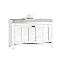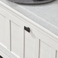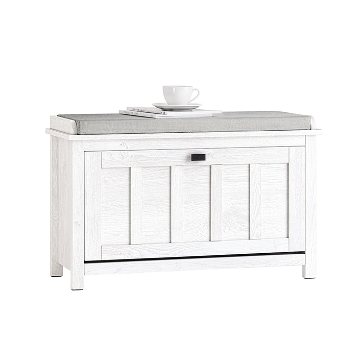 Introductie van de Shoe Bench, een elegante en praktische toevoeging aan elke hal. Deze vintage witte bank biedt niet alleen een comfortabele zitmogelijkheid, maar beschikt ook over een schoenenkantelaar, waardoor hij perfect is voor het opbergen van verschillende schoenmaten en -stijlen.