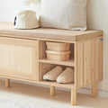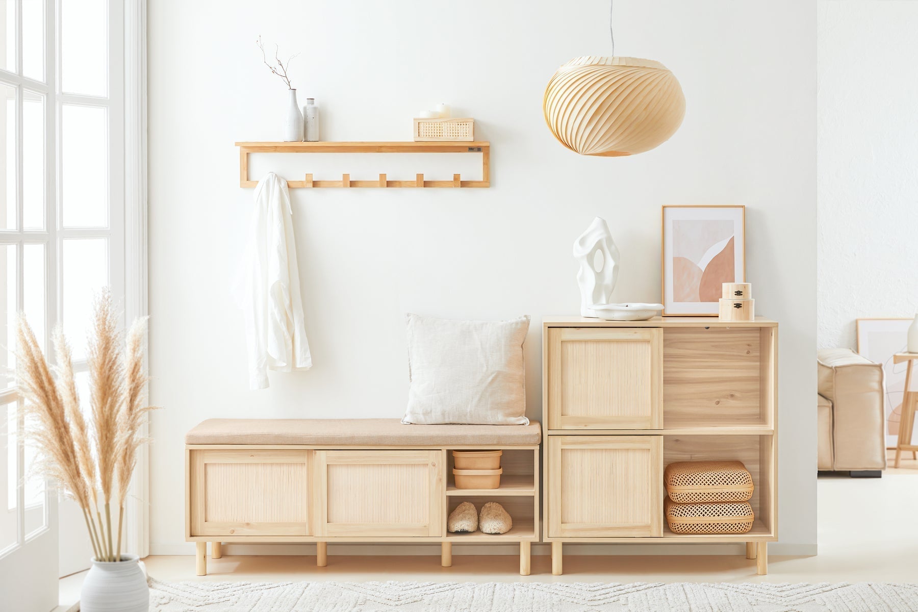 Deze schoenenkast is een perfecte mix van stijl en functionaliteit, met bamboe schuifdeuren die zorgen voor elegantie en schimmelpreventie.