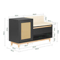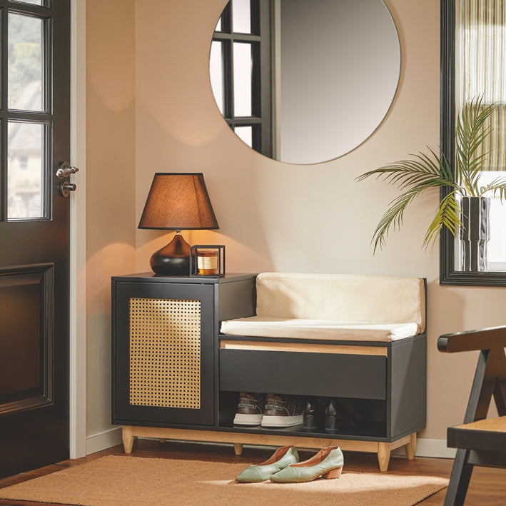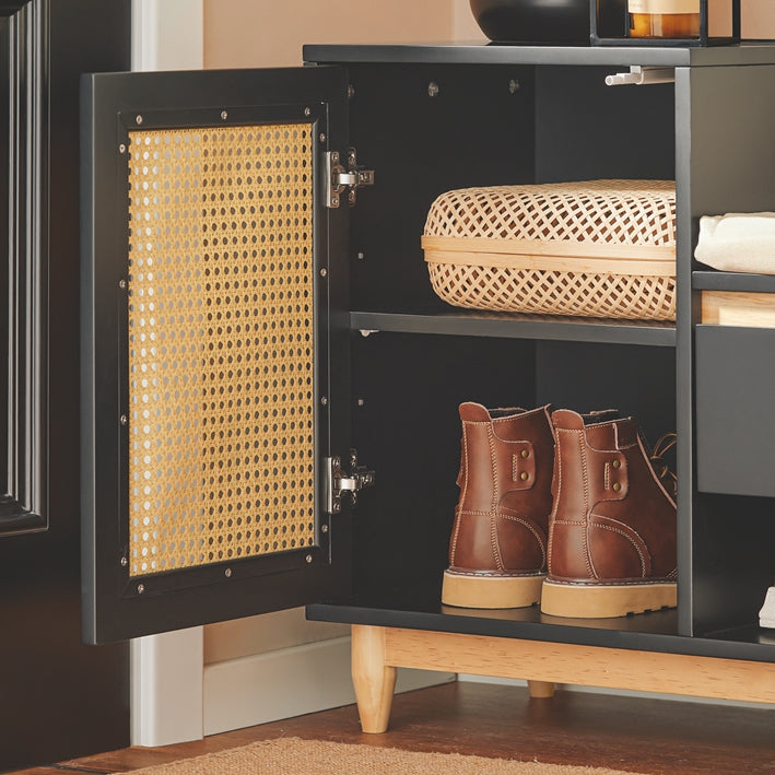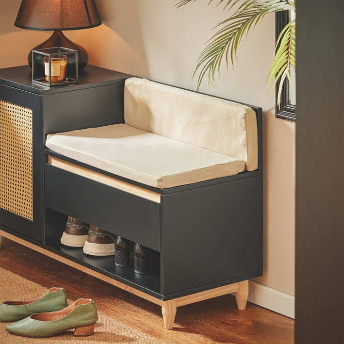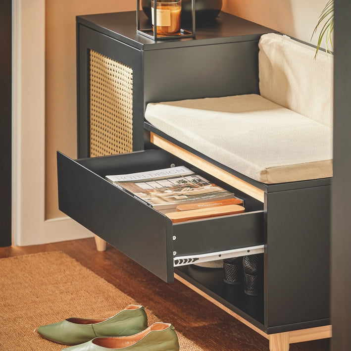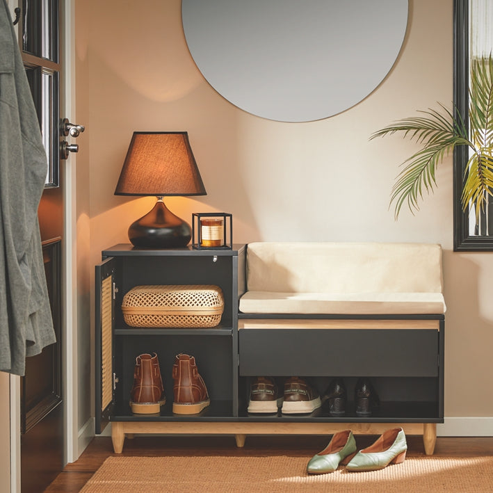 Deze schoenenkast bestaat uit een open vak, een lade en een deur, waardoor er voldoende opbergruimte is. De gele gaasdeur zorgt voor een natuurlijke charme en bescherming tegen schimmels. De verstelbare plank zorgt voor veelzijdige opbergmogelijkheden, terwijl het gele kussen en de grenen poten stabiliteit en comfort bieden.