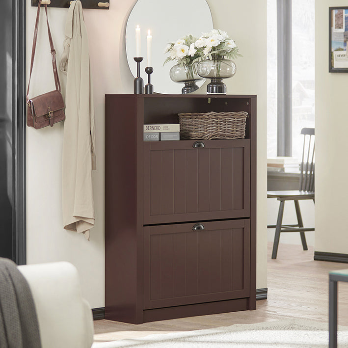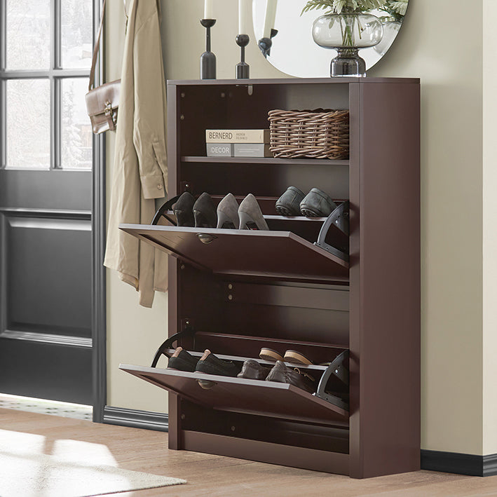 Een veelzijdige schoenenkast met 2 kleppen voor het opbergen van diverse schoenmaten, een extra vak voor accessoires, verkrijgbaar in 3 kleuren.
