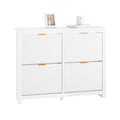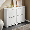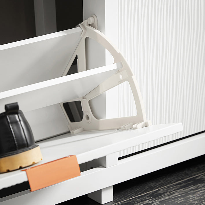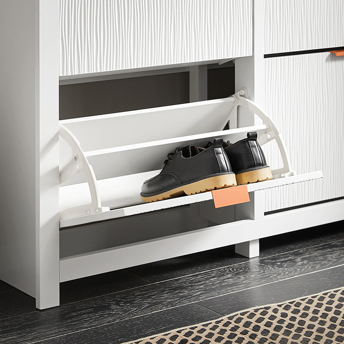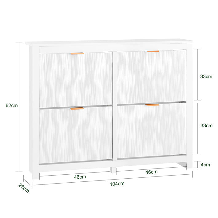 De Schoenenkast in Wit is een stijlvolle en functionele opbergoplossing voor alle entrees. Deze schoenenkast is gemaakt van veerkrachtig MDF (E1) materiaal, met afmetingen circa 104x82x23cm. Het beschikt over 4 kleppen voor veelzijdige schoenenopslag en een modern ontwerp met gouden handvatten.