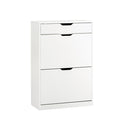 De Schoenenkast met kleppen en lade biedt slimme opbergoplossingen voor schoenen en andere spullen. Met veerkrachtig materiaal en compacte afmetingen zorgt het voor een elegante en stabiele organisatie van uw essentiële spullen.