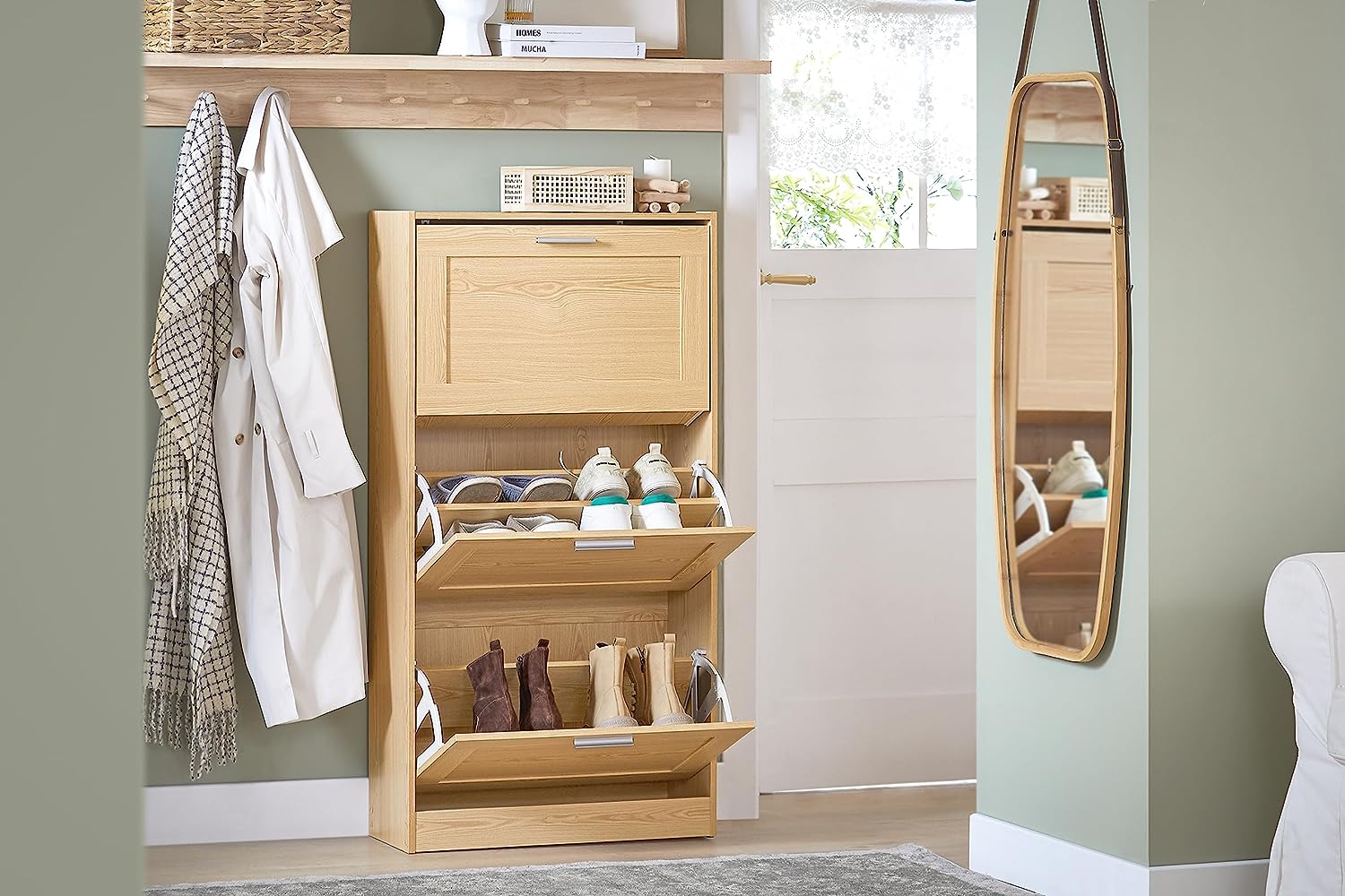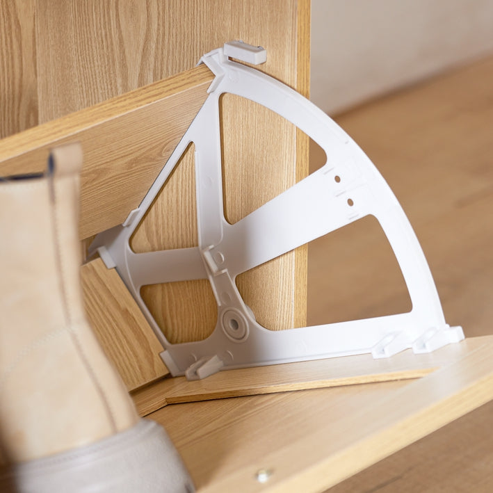 De Schoenenkast is een veelzijdige opbergoplossing voor entreeruimtes en biedt functionaliteit en stijl. Met 3 kleppen is er plaats voor schoenen van verschillende maten, terwijl het bord perfect is voor sleutels, fotoalbums en meer.