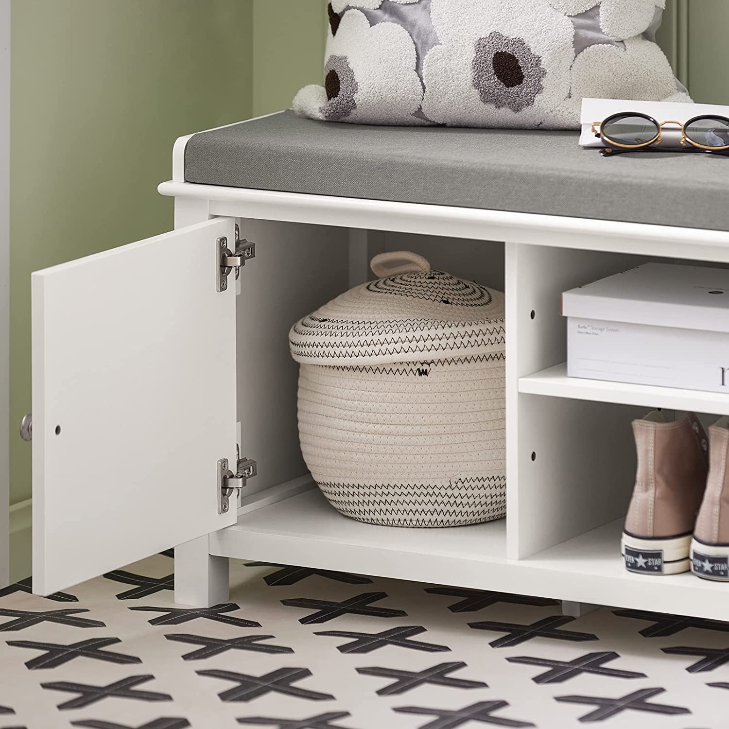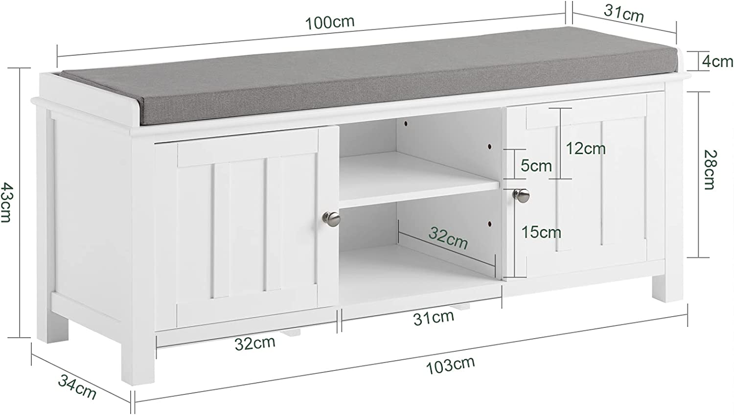 Schoenenopbergbank met 2 deuren en afneembaar zitkussen - Schoenenkast - Wit
