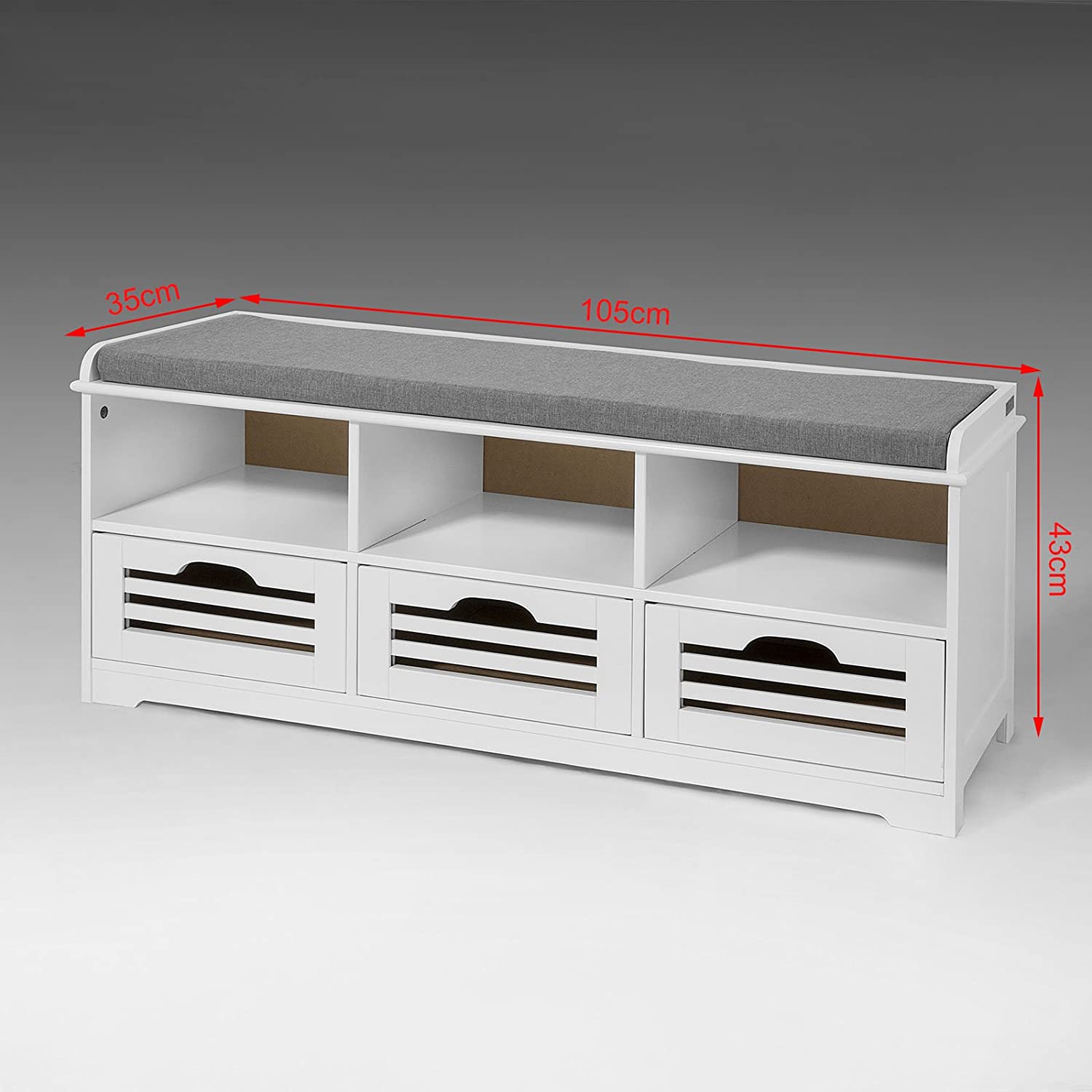 Details: Modern design bank met 3 lades, 3 kubussen en 1 zacht zitkussen, goede keuze voor hal en woonkamer. De gewatteerde zitting die afneembaar is, is ideaal voor comfortabel zitten tijdens het aan- en uittrekken van schoenen. 3 kubussen geven extra opbergruimte in de gangplaats. 3 lades bieden voldoende opbergruimte voor schoenen, dozen, boeken, tijdschriften etc. Bovendien zijn ze volledig uittrekbaar als opbergoplossing. Productdetails Productafmetingen: B105 × D35 × H43cm; Kubusafmetingen: L33 × B33 × H15cm; Materiaal: MDF/polyester, linnenachtige stof/spons; Gewicht: 19,7 kg; Draagvermogen: Bank: 120kg. Lade: 5 kg. Het artikel wordt geleverd in een platte verpakking en vereist zelfmontage. Gedetailleerde instructies meegeleverd. De decoratieve elementen zijn niet bij de levering inbegrepen. Met BTW-factuur; De bestelling wordt dezelfde dag verzonden als deze voor 14.00 uur geplaatst is. Als u vragen heeft, neem dan per e-mail contact met ons op, wij zullen zo snel mogelijk antwoorden!