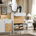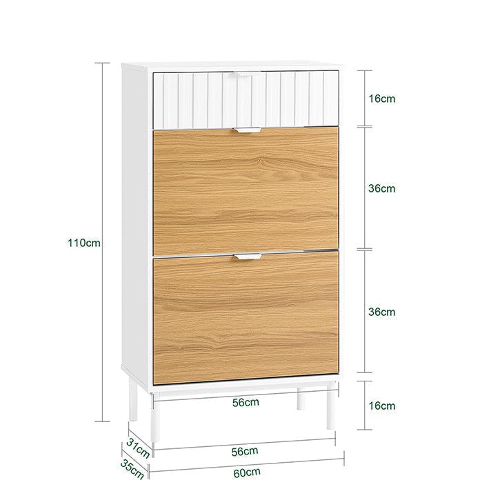 De Schoenenopbergorganisator is ontworpen om je schoenen in verschillende maten en vormen te bewaren met twee opvouwbare konijnen. In de ruime lade kunt u sjaals, hoeden en meer opbergen, zodat u uw spullen netjes en georganiseerd kunt opbergen. De metalen poten zorgen dankzij een hoogte van 16 cm voor stabiliteit en compatibiliteit met de meeste veegrobots. Je kunt deze organizer ook combineren met het dressoir (FSB91 WN) voor een complete set.