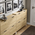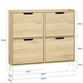 De Schoenenkast is een veelzijdige opbergoplossing voor alle entrees. Met afmetingen van circa 100x90x19cm is hij slechts 19cm diep, waardoor hij geschikt is voor smalle ruimtes. Gemaakt van MDF en metaal, biedt het een veerkracht tot 60 kg. Dankzij de 4 kleppen kunnen verschillende schoenmaten en -ontwerpen worden opgeborgen.