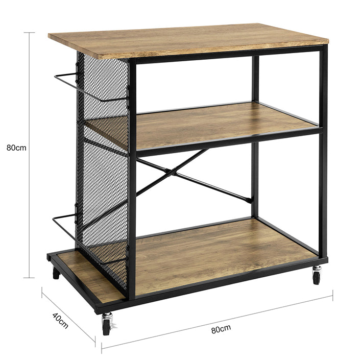 Serveerwagen - Zijwagen - Mobiele wagen - Industrieel Design - Vintage oppervlak - 3 Planken Opslag - 4 Roterende Wielen met Rem - 80cm x 80cm x 40cm