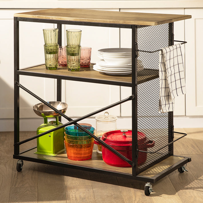 Introductie van de Serveerwagen, een essentiële toevoeging aan elk modern huis of kantoor. Deze veelzijdige trolley combineert een strak industrieel ontwerp met een vintage oppervlak en biedt zowel esthetische aantrekkingskracht als praktische functionaliteit. Dankzij de stevige constructie en slimme functies is hij ideaal voor allerlei toepassingen, van het serveren van drankjes tot het organiseren van benodigdheden.