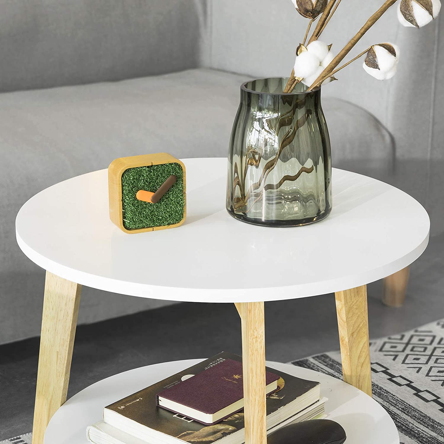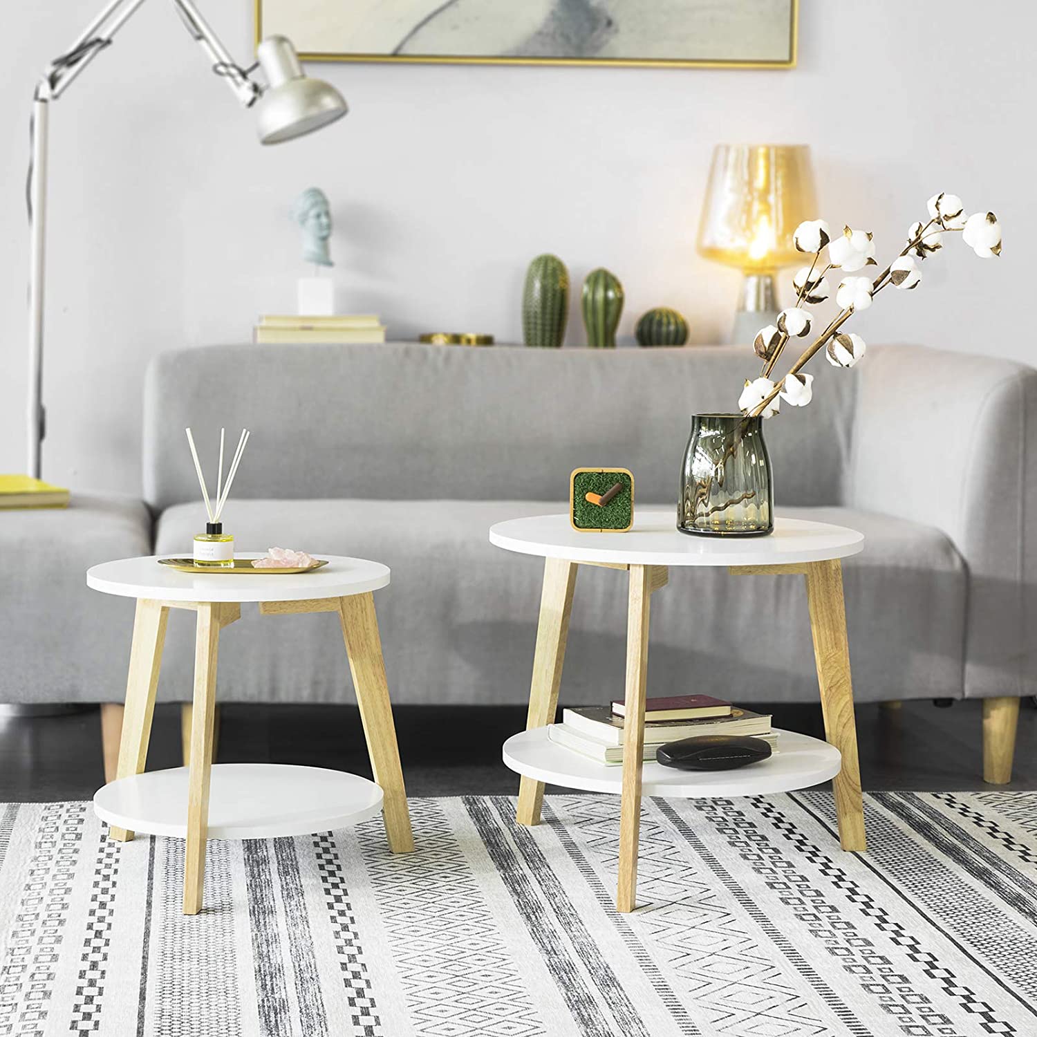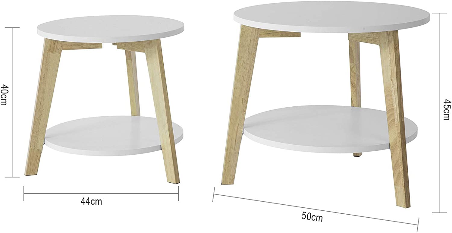 Details: Moderne bijzettafels passen perfect bij uw moderne of traditionele inrichting. 2 tafels ontworpen voor gratis combinatie en handig gebruik in woonkamer, slaapkamer en kantoor om snacks, drankjes, boeken, lampen enz. bij de hand te hebben. Het is geweldig om te gebruiken als bank/bijzettafel, zodat je bij de hand hebt wat je nodig hebt. Praktisch en ruimtebesparend, perfect voor appartementen en beperkte ruimte. Productdetails Materiaal: MDF, rubberhout. Afmetingen: Grote tafel: Ø 50 (diameter) x 45cm (hoogte); Kleine tafel: Ø 40 (diameter) x 40 cm (hoogte). Gewicht: 8 kg. Draagvermogen: Bovenblad: 10 kg, plank: 15 kg. Het artikel wordt geleverd in een platte verpakking en vereist zelfmontage. Gedetailleerde instructies meegeleverd. De decoratieve elementen zijn niet bij de levering inbegrepen. Als u vragen heeft, neem dan per e-mail contact met ons op, wij zullen zo snel mogelijk antwoorden!