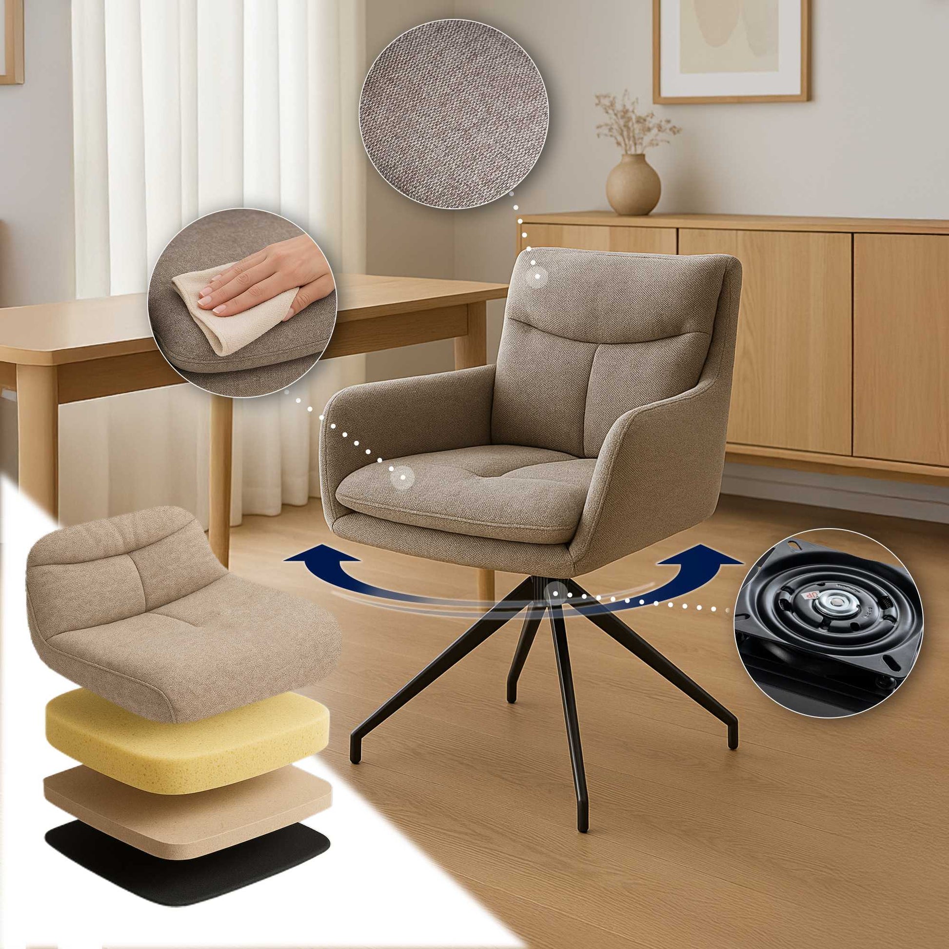 Deze set van 2 draaibare eetkamerstoelen combineert stijlvol design met comfort, perfect geschikt voor keuken, eetkamer of woonkamer. De hoogwaardige, slijtvast stoffen bekleding voelt zacht aan, zelfs bij dagelijks gebruik. De comfortabele, dik gestoffeerde zitting zorgt voor langdurig zitplezier en nodigt uit om te blijven zitten.