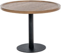 De ronde houten tafelbladen geven een natuurlijke, warme uitstraling, terwijl de stevige, matzwarte, gepoedercoate metalen frames stabiliteit en een moderne look bieden. Vloerbeschermers beschermen gevoelige vloeren tegen krassen.