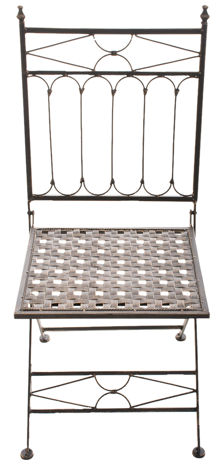 De stoelen zijn handgemaakt van ijzer en daardoor uiterst stevig. Het oppervlak is bewerkt met een handgemaakte antieke patina. Deze stijlvolle designstukken zijn absoluut nieuw en passen perfect bij alle metalen tafels in onze winkel.